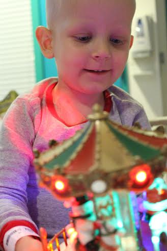 That night, after the tests and the bath and after “Sad-Sad Boingy Tube” got hooked back up to the IV pole, and after Caemon and Mama had a nap, and I decorated the room with trees and lights and as much magic as I could muster, we sat together in his room, and we gave Caemon what he affectionately called his special BMT present: a little Christmas carousel that lit up and played music, something he had admired countless times the year before both in a store and in a book we had. Caemon loved carousels, so to have one of his one was pretty fabulous. He snuggled up by himself in his bed, turned it on, and lost himself in it.