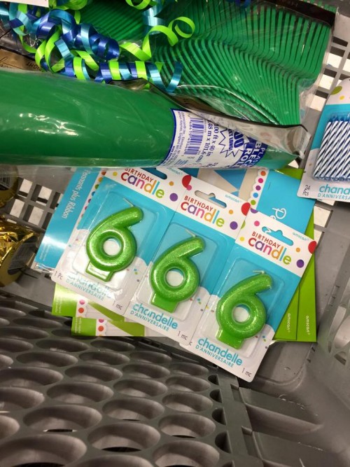 The only thing that gave me pause about the whole event happened when I was standing in line to purchase decorations. I looked down into my cart and realized there were three “6” birthday candles. The way they were arranged I saw “666” — now no one wants to go to that party! It proved not to be an omen, thank goodness.
