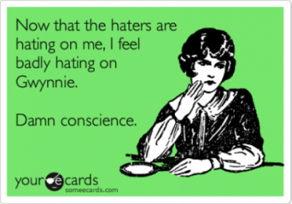 A few years ago I made quite an Internet name for myself by dissing Gwyneth Paltrow. Those posts (there were two of them) garnered me more than a few Facebook followers and the respect and admiration of lots of Internet strangers. When I look back at them now, I cringe a bit, and then I sigh, and then I feel gratitude that each day I forge what I try and forge on this here Internet, I am not the blogger I was in early 2011.